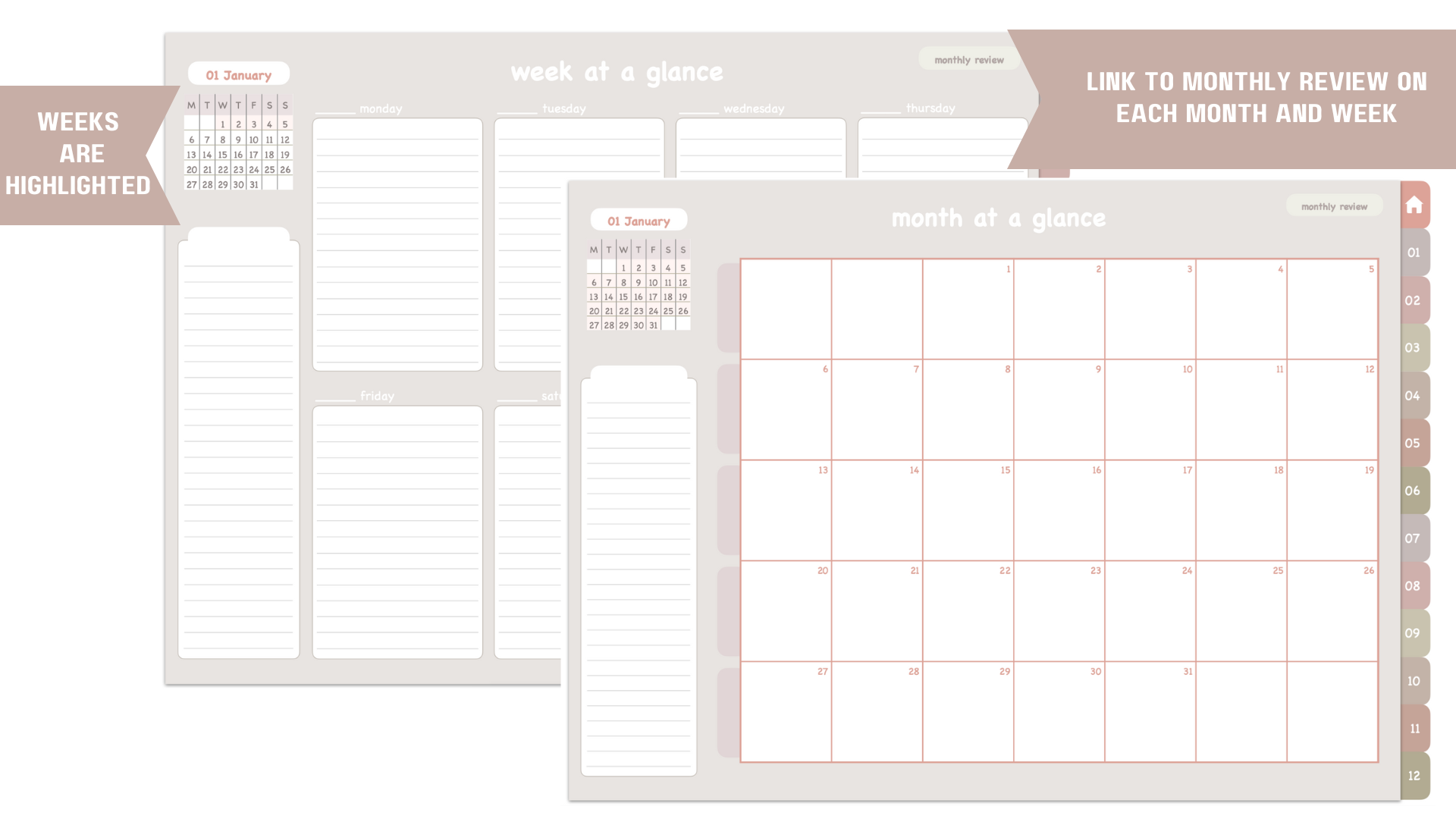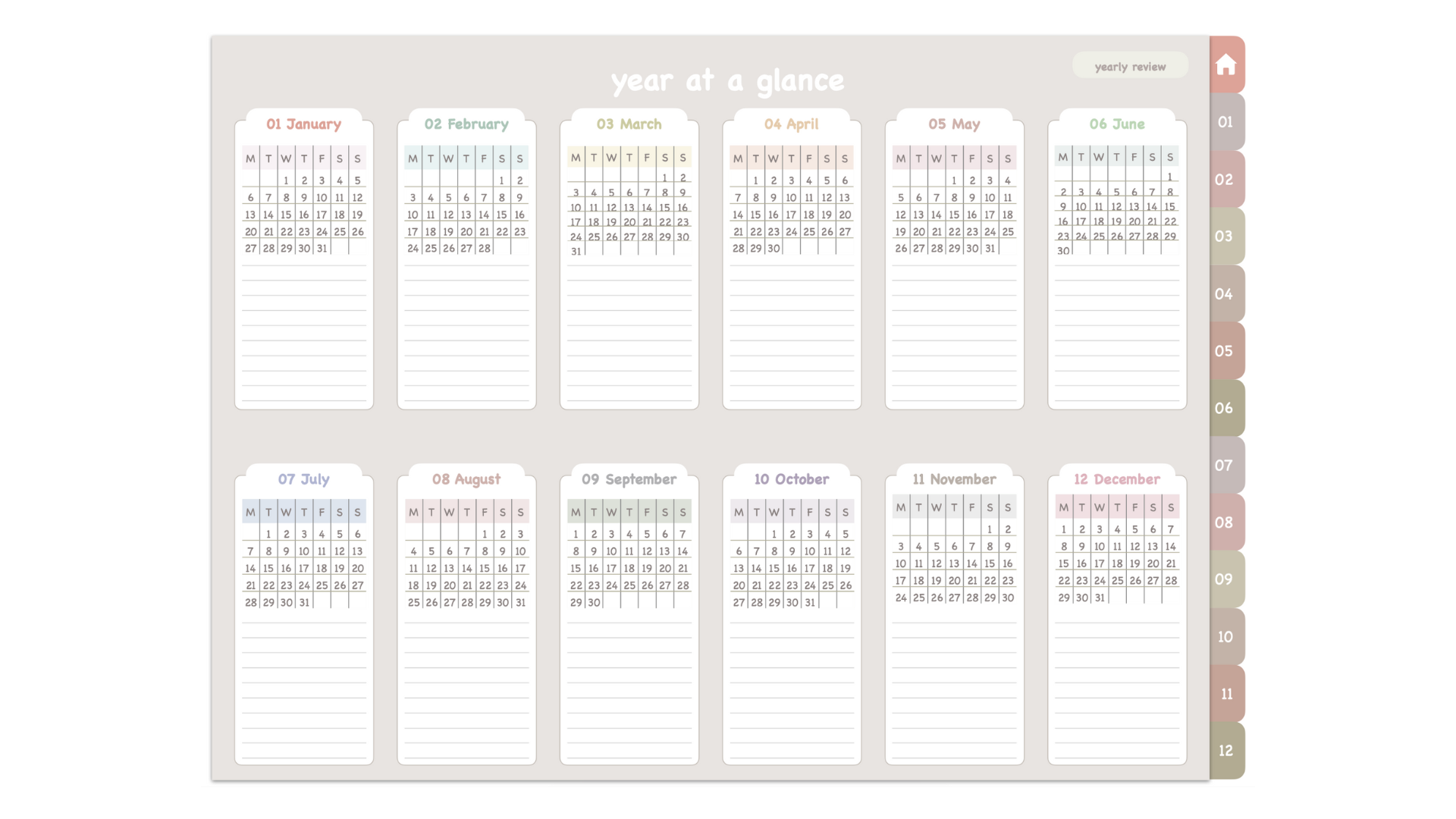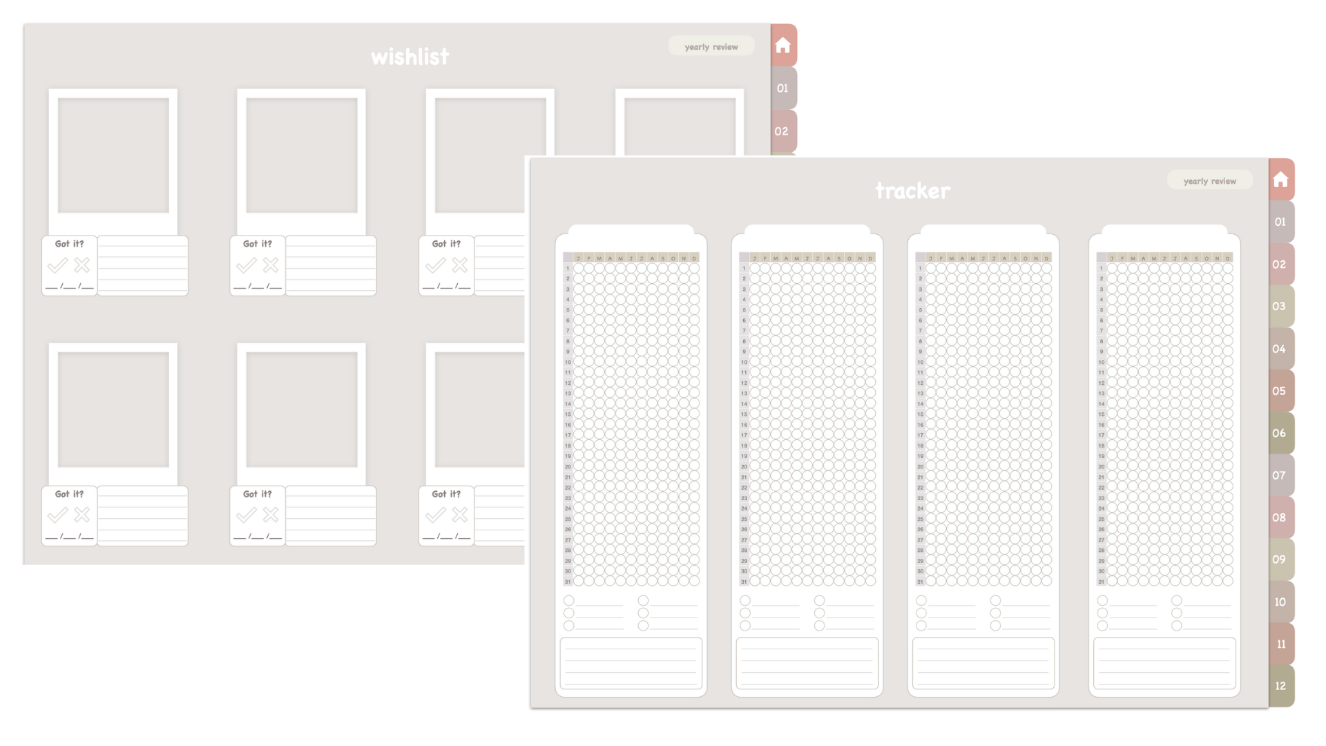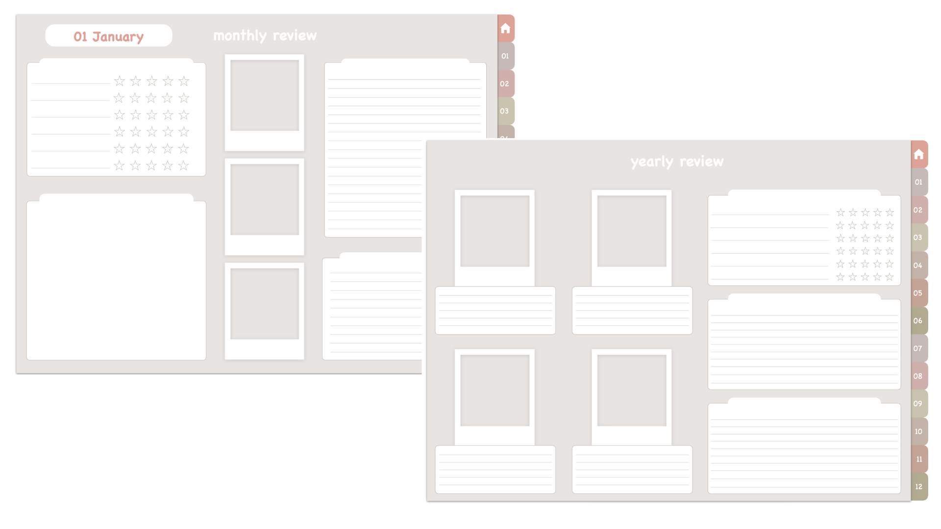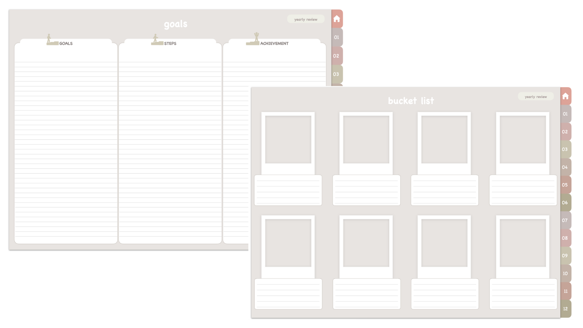 You’ll get year, months and weeks at a glance + some additional pages to check in your life journey.