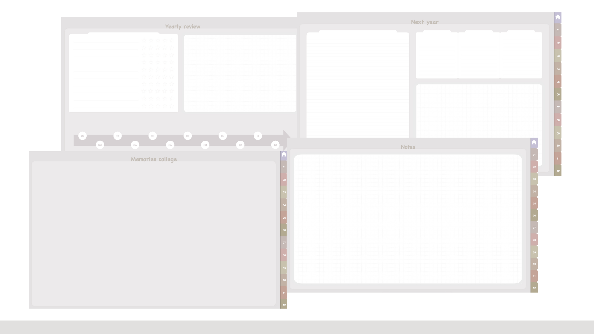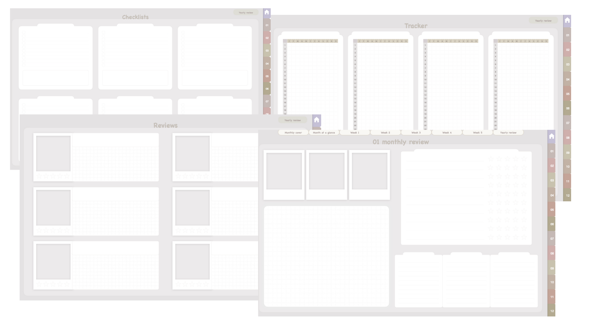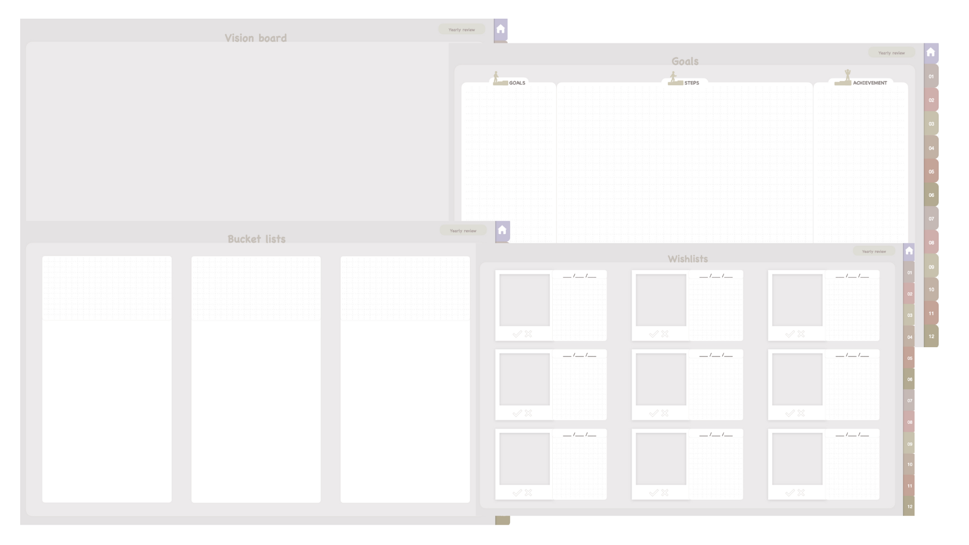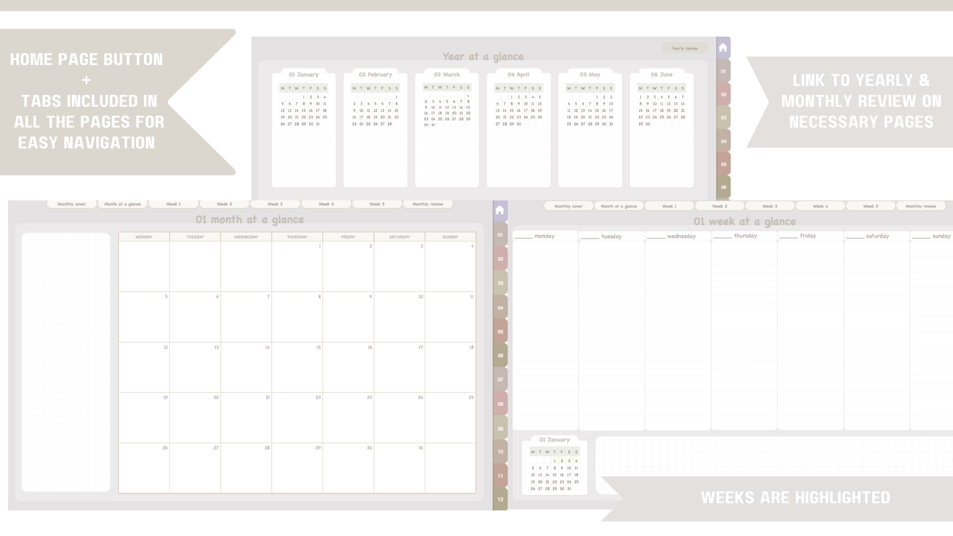 You’ll get year, months and weeks at a glance + some additional pages to plan and reflect on your life journey.